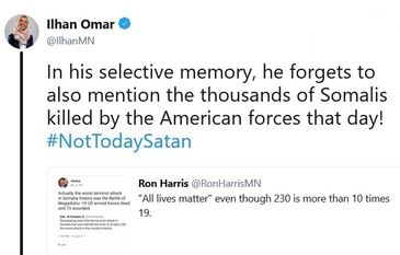 “In his selective memory, [the writer] forgets to also mention the thousands of Somalis killed by the American forces that day! #NotTodaySatan,” Omar wrote while still a Minnesota state legislator.